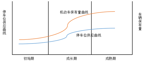 居民消費(fèi)水平的提高拉動(dòng)了汽車消費(fèi),而汽車保有量的持續(xù)提高促進(jìn)了停車設(shè)施需求的擴(kuò)大。機(jī)動(dòng)車保有量與停車泊位在不同發(fā)展時(shí)期的關(guān)系如下圖所示: