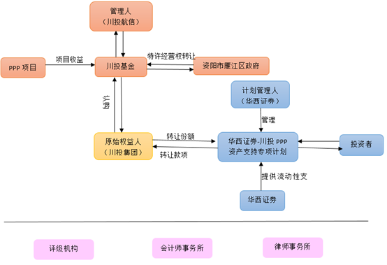 此項(xiàng)所涉及基礎(chǔ)資產(chǎn)為資陽(yáng)市雁江區(qū)停車場(chǎng)PPP項(xiàng)目經(jīng)營(yíng)權(quán),資陽(yáng)市雁江區(qū)停車場(chǎng)PPP項(xiàng)目總投資3.09億元,合作期限12年,采用TOT模式運(yùn)營(yíng)。城東新區(qū)管委會(huì)通過(guò)簽訂PPP項(xiàng)目合同及其他相關(guān)法律文件將雁江區(qū)停車場(chǎng)PPP項(xiàng)目的特許經(jīng)營(yíng)權(quán)轉(zhuǎn)讓于私募基金(川投航信天泰2號(hào)私募投資基金),履行運(yùn)營(yíng)維護(hù)義務(wù),并享受相應(yīng)收益。