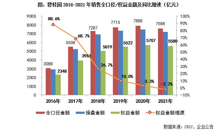 2021年行業(yè)下行調(diào)整、市場波動(dòng)加劇,規(guī)模房企整體目前完成情況不及歷史同期,有逾8成企業(yè)未完成全年業(yè)績目標(biāo)。碧桂園雖然業(yè)績規(guī)模也略有下降,但在全口徑、操盤、權(quán)益三大口徑的業(yè)績規(guī)模均保持在行業(yè)第一的位置。