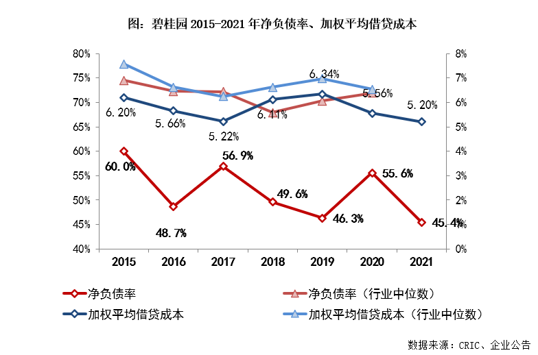 【凈負(fù)債率45.4%,融資成本保持行業(yè)低位】2021年,碧桂園實(shí)現(xiàn)營業(yè)收入5230.6億元,同比增長13%。毛利潤927.8億元、凈利潤409.8億元;毛利率17.7%、凈利率7.8%、核心凈利率5.1%,較去年同期均有不同程度的降低。截至2021年末,碧桂園總有息負(fù)債下降至3179.2億元,凈負(fù)債率45.4%,較2020年末降低10.2個(gè)百分點(diǎn)。期末融資成本較去年末降低36個(gè)基點(diǎn)至5.2%。