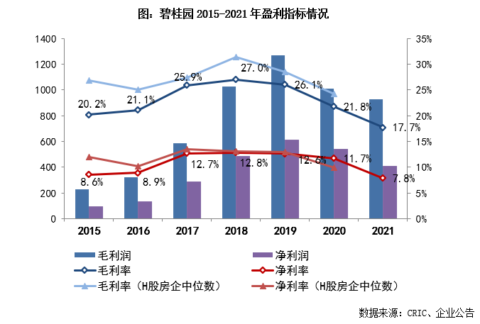 2021年,碧桂園實(shí)現(xiàn)營業(yè)收入5230.6億元,同比增長13%;毛利潤927.8億元、凈利潤409.8億元;歸母凈利潤268億元、核心凈利潤269.3億元。毛利規(guī)模的下降主要是受到2017、2018年部分高成本獲取的低毛利項(xiàng)目進(jìn)入交付和2021下半年市場下行行業(yè)降價(jià)促銷影響,對(duì)結(jié)算利潤率水平有一定影響。2021年,碧桂園實(shí)現(xiàn)毛利率17.7%、凈利率7.8%、核心凈利率5.1%,較去年同期均有不同程度的降低。管理層預(yù)計(jì),目前短期內(nèi)還處于市場出清的過程中,中長期毛利率水平有改善空間。