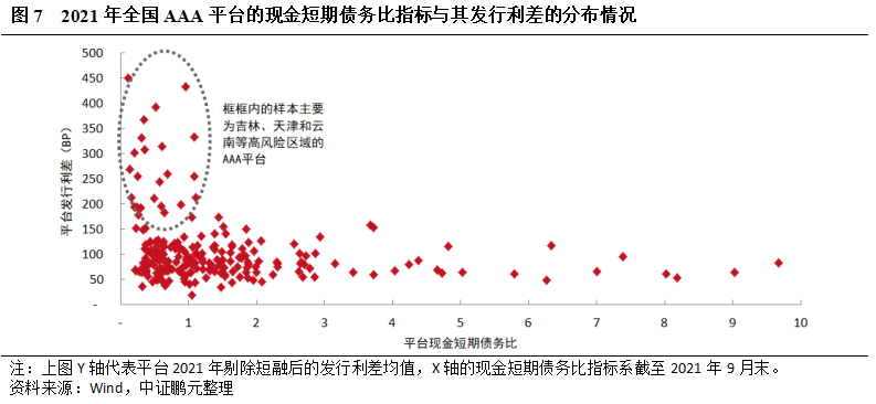 在吉林、天津、云南等高風(fēng)險(xiǎn)區(qū)域的AAA平臺(tái)普遍表現(xiàn)出“現(xiàn)金短期債務(wù)指標(biāo)低、發(fā)行利差高”特征