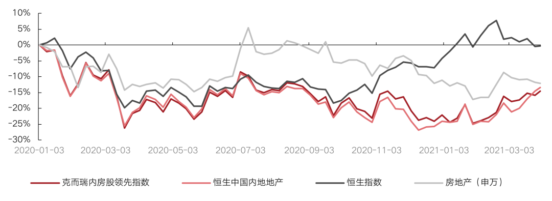 圖:克而瑞內(nèi)房股領(lǐng)先指數(shù)及恒生中國內(nèi)地地產(chǎn)指數(shù)走勢(shì)