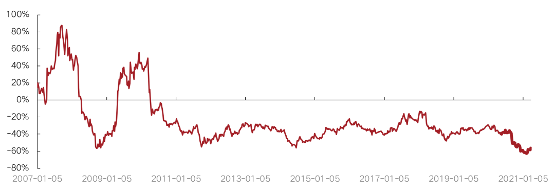 具體而言,2021年3月相對(duì)恒指成分股的PE周均值為-57.8%,高于2月相對(duì)PE周均值-61.1%,低于2020年全年相對(duì)PE周均值-41.3%。克而瑞內(nèi)房股領(lǐng)先指數(shù)成分股整體PE周均值為7.20,高于2月周均值7.02,高于2020年全年周均值7.17。恒指成分股3月整體PE周均值為17.05,低于2月周均值18.07,高于2020年全年的周均值12.49。