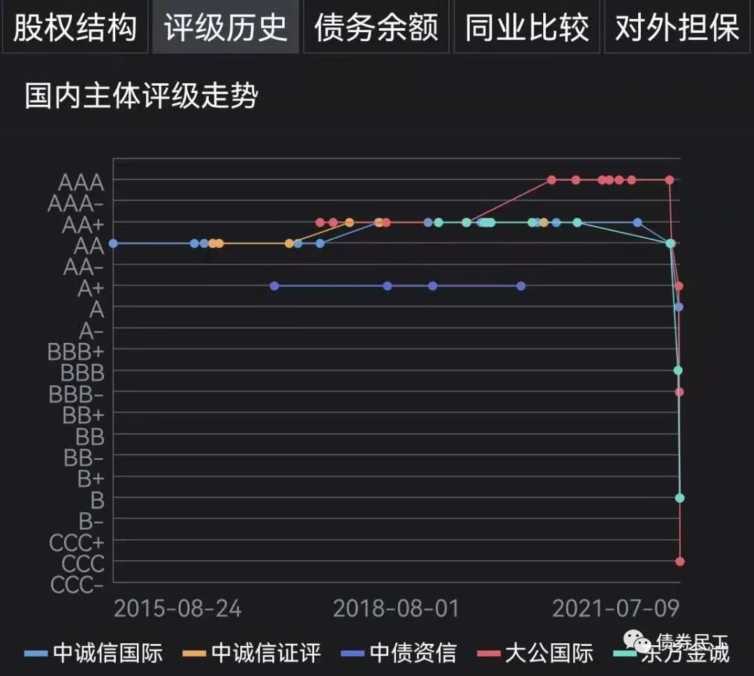 藍光發展的實際控制人是楊鏗,是四川省最大的房地產開發公司,位列2020年中國房地產企業銷售排行榜操盤金額第39位。。藍光發展的評級機構包括中誠信國際、大公國際和東方金誠,主體信用評級最高達到AAA,目前最新評級為CCC。近年來,藍光發展的信用評級經歷了大起大落,評級變動主要是集中在2021年6月份以來。此次債券違約之后,預計主體信用評級可能會進一步下調。
