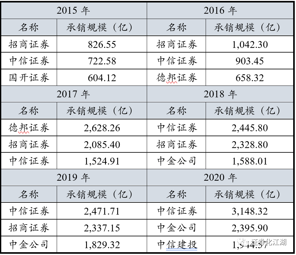 過去幾年,排名靠前的券商名單里存在個體的起伏,本文著重分析2020年排名靠前券商的承銷情況和產品類別明細,以探求各家的優勢和特點,一窺目前市場的概況和趨勢。