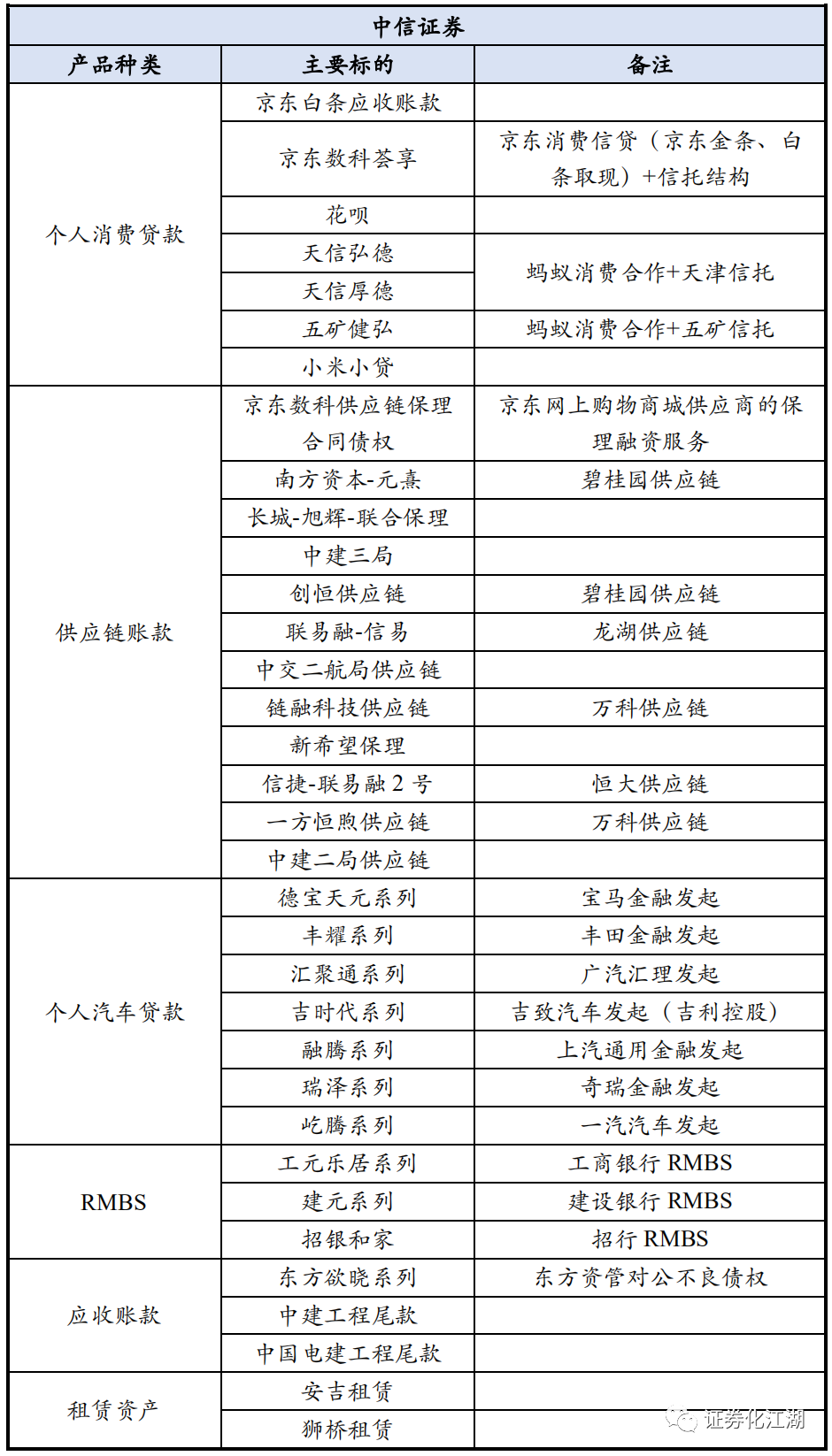 (2)信貸類ABS(RMBS、車貸clo等)、消費金融abs(尤其是螞蟻和京東生態圈)、供應鏈和應收賬款abs(尤其是房企供應鏈、央企應收應付)是承銷規模的基本盤,這幾類產品規模決定了能否沖進前五或前三榜單。