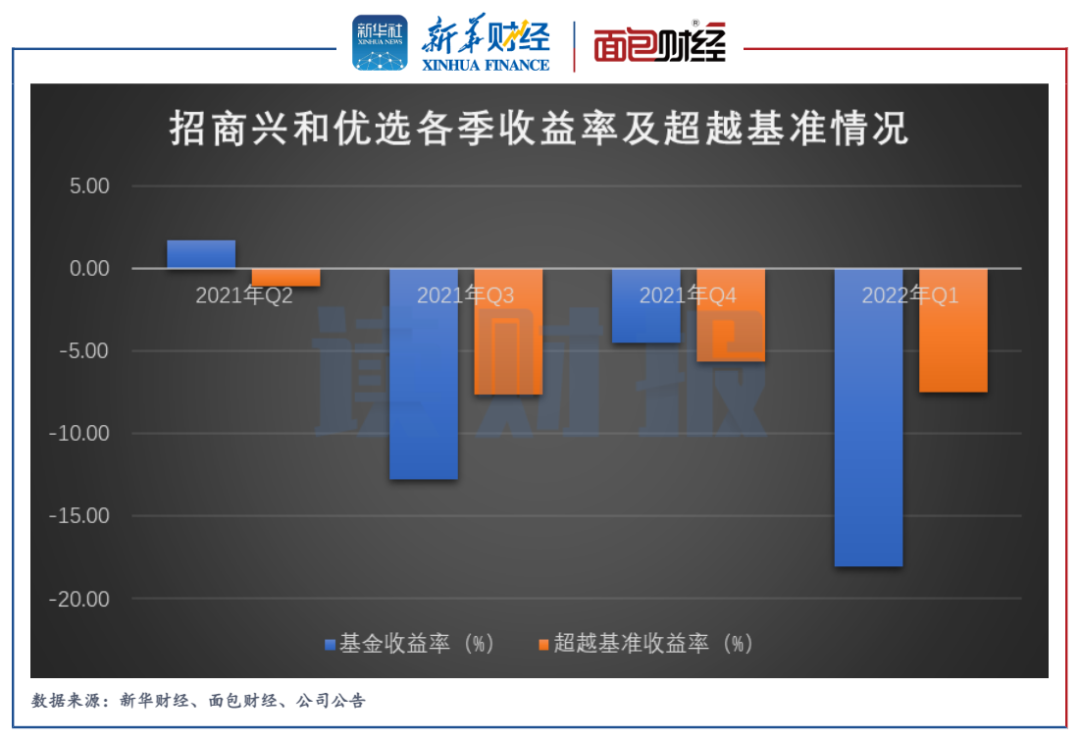 2021年二季度以來的完整四個(gè)季度,招商興和優(yōu)選僅在2021年二季度獲得正收益,其余三個(gè)季度均錄得虧損。更為重要的是,這四個(gè)季度該基金均未跑贏業(yè)績(jī)比較基準(zhǔn)。