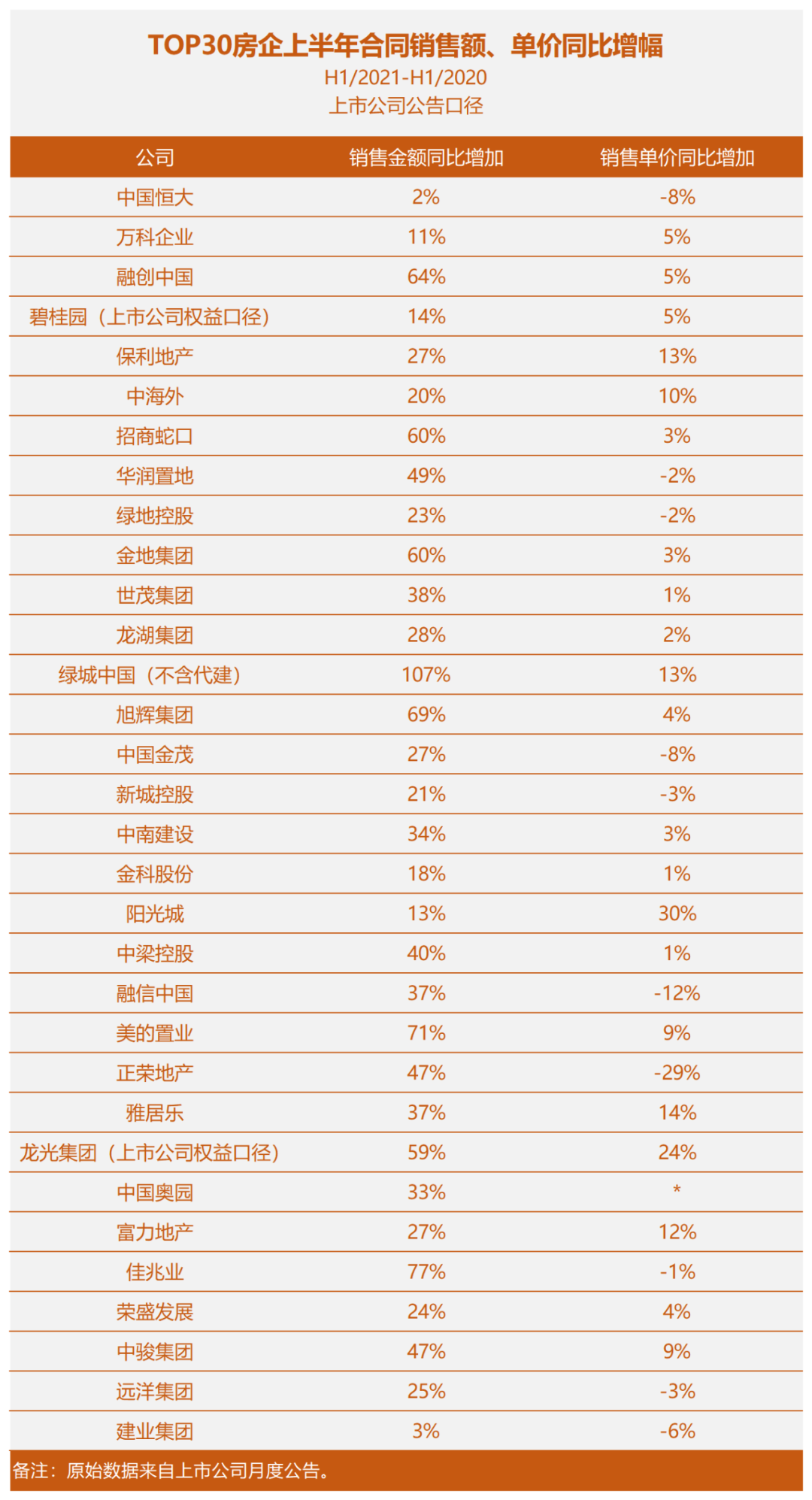 從銷售單價來看,TOP30房企的銷售均價上漲了5.3%。
