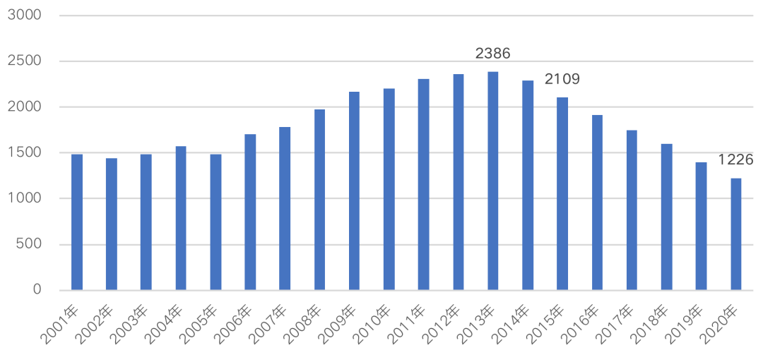 2001年-2020年內地居民初婚登記人數顯示,2013年以后我國的初婚人數便呈現出明顯的下降趨勢,近五年年均減少量接近180萬;截止至2020年末,全國內地初婚人數僅有1226萬人,較五年前減少了四成多。