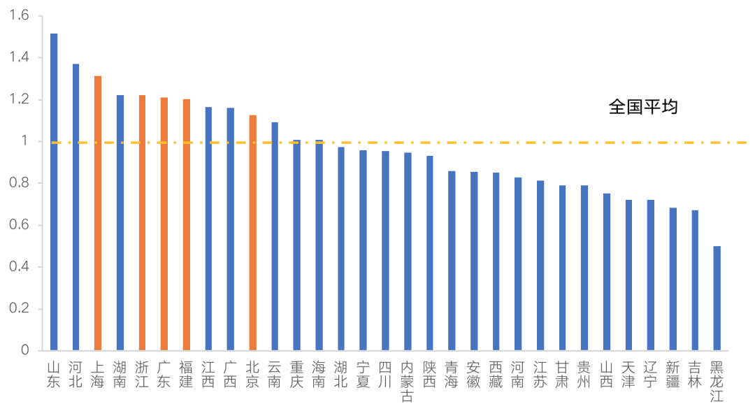 因此,為了進一步探知這些外來人口規模大的城市常住和戶籍人口的婚房需求差異,我們結合這些城市的常住人口出生量,并與初婚登記人數進行對比。以出生初婚人口比(常住出生人數/近兩年初婚登記對數)指標來看,山東、河北、上海等13個省市的出生初婚比高于全國平均水平。