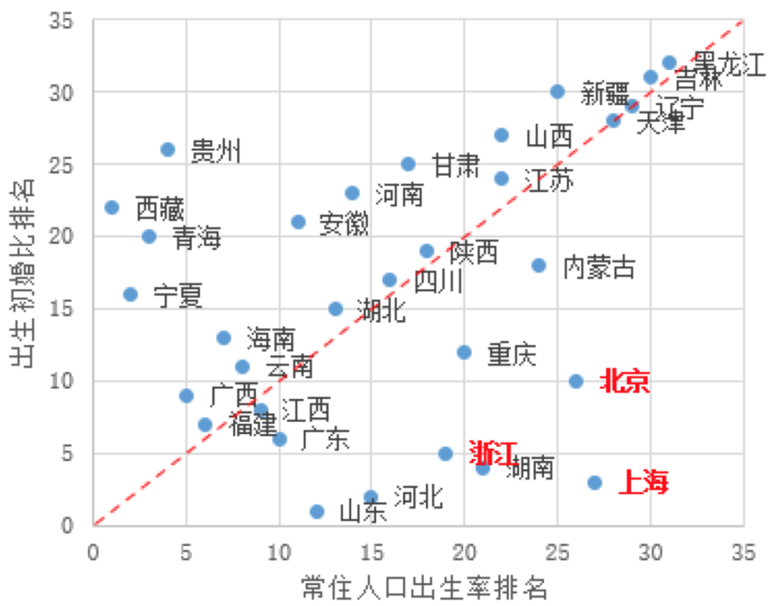北京、上海等結婚率本就較低的城市,出生初婚比較高的原因是由于這些城市外來人口規模較大,雖然戶籍暫未遷入,但已長期在本地生活并安家生子,本地新生兒人數明顯超過戶籍出生人數。結合常住人口出生率排名來看,北京、上海出生率排名明顯低于出生初婚比排名,這也從側面反映出北京、上海、浙江等省市對外來年輕人的吸引力較強,黏性也比較強。