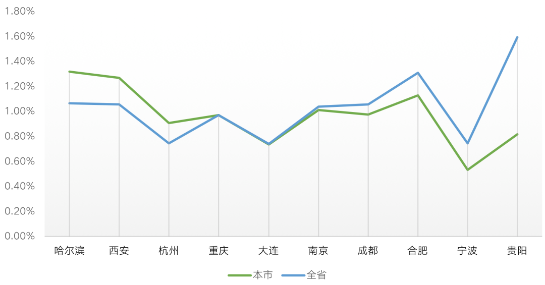 從部分人口凈流入的典型熱門城市來看,和省內平均水平相比,大部分城市的初婚率都低于全省平均水平,僅哈爾濱、西安、杭州等少數城市的初婚率高于全省平均水平,其中哈爾濱的初婚率達1.32%,高于全省平均水平0.25個百分點。