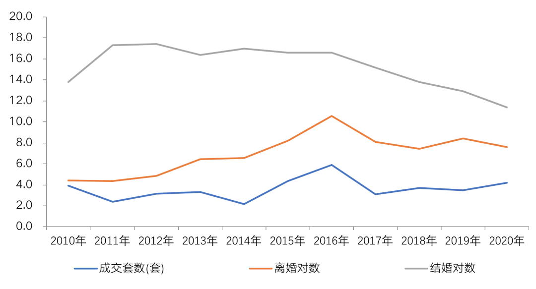 近年來在購房壓力快速增長、年輕人婚育觀念轉變等因素的影響下,全國初婚登記人數呈現快速下滑的趨勢。雖然結婚人數持續下降,但在“丈母娘效應”下,婚房需求仍一直是住宅市場需求側的重要支撐,即使在2020年婚房需求粗略估計仍能占住宅市場成交量的五成左右,中長期內也仍將是商品住宅市場需求的重要支撐。