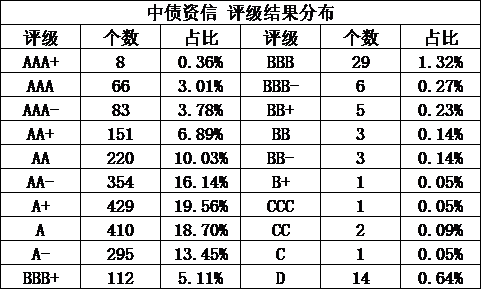 中債資信的評(píng)級(jí)符號(hào)比較特殊,多了AAA+、AAA-,且評(píng)級(jí)中樞分布于A+附近,大大增加了了區(qū)分度,成為我國(guó)信用債評(píng)級(jí)機(jī)構(gòu)中的一股清流。