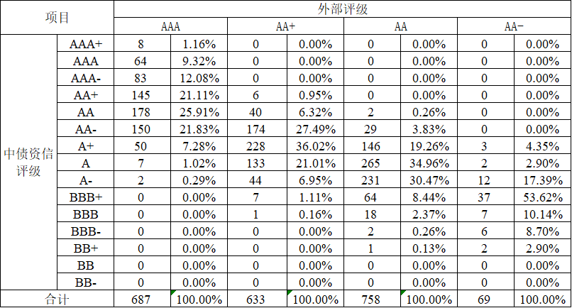 此外,外部評(píng)級(jí)的AA+,普遍集中于中債資信的[AA-,A],外部評(píng)級(jí)的AA,普遍集中于中債資信的[A+,A-]。