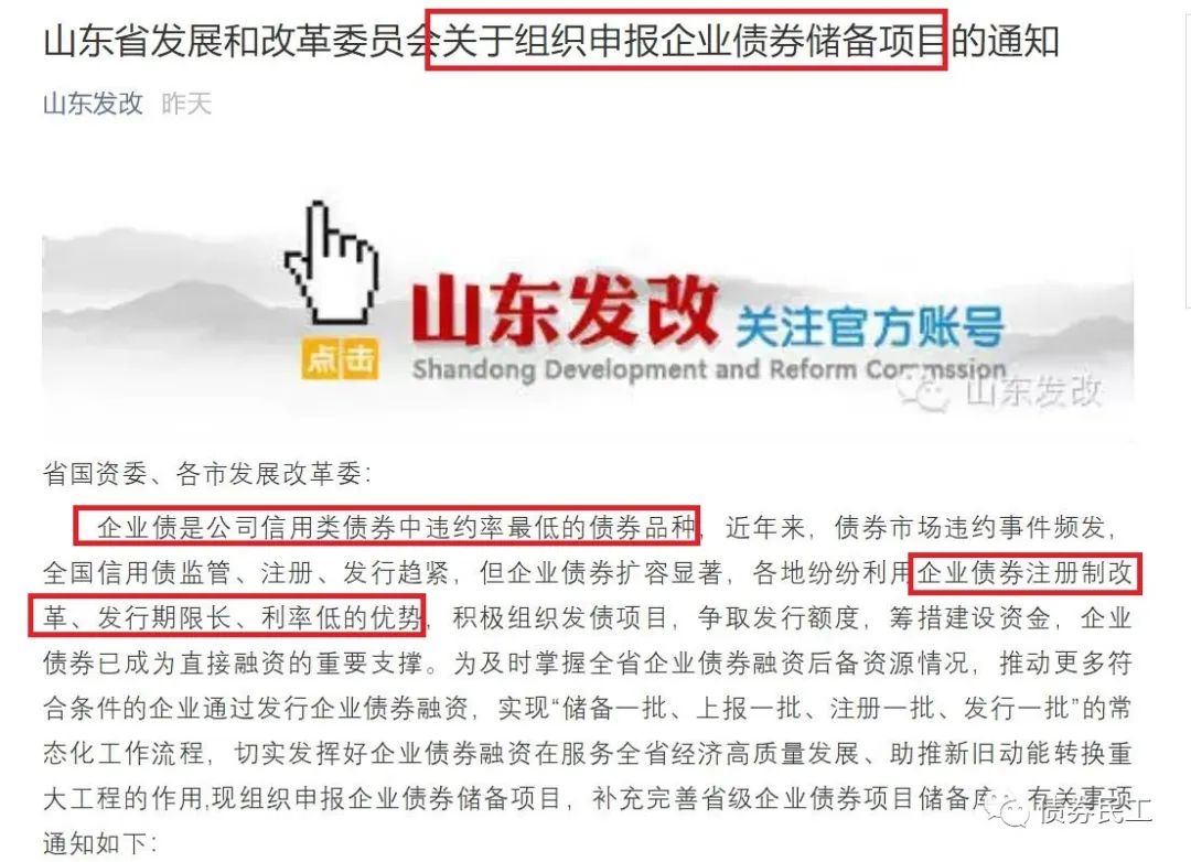 山東省發(fā)改委于2021年11月9日印發(fā)的《關于組織申報企業(yè)債券儲備項目的通知》直接在債券民工的朋友圈刷屏了,明確提出“企業(yè)債券是違約率最低的債券品種”,具備“注冊制改革、發(fā)行期限長、利率低”的優(yōu)勢。