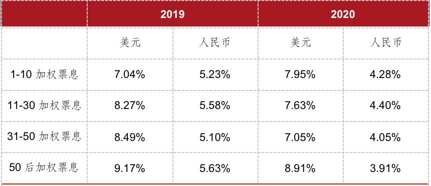 2020年前8月,前十發(fā)債集中度提升,人民幣債加權(quán)票息下降明顯。與銷售業(yè)績集中度提升的方向一致,資金向頭部房企集中以規(guī)避中小房企在調(diào)控中存在的各類不確定性風(fēng)險(xiǎn)。