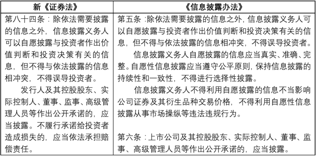 公開承諾披露是對自愿披露的限制,一旦公開承諾,該承諾內容便成為特殊的強制披露內容,不再屬于自愿披露內容。[9]由此新《證券法》第八十四條第二款和《信息披露辦法》第六款新增了公開承諾披露制度。承諾人不履行承諾給投資者造成損失的,依法承擔賠償責任。