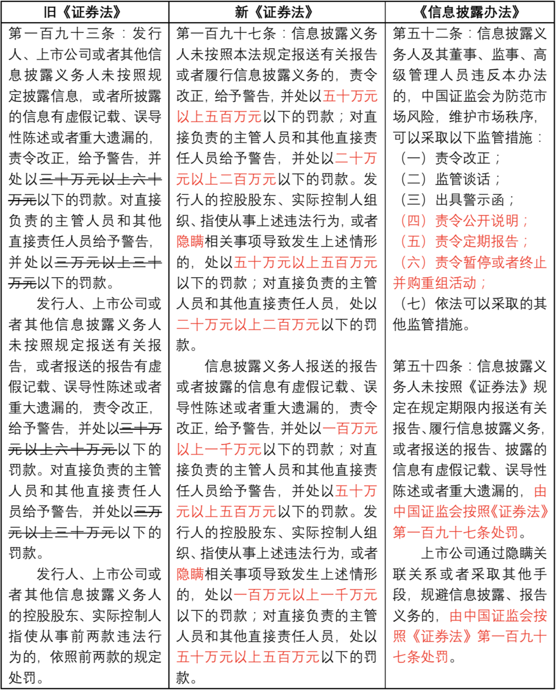第二,顯著提高了行政處罰金額。對于未按規定報送和披露情形,信息披露義務人的罰款從30-60萬元提升到50-500萬元,直接負責的主管人員和其他直接責任人員的罰款從3-30萬元提升到20-200萬元;對于報送和披露存在信披違法情形,信息披露義務人的罰款從30-60萬元提升到100-1000萬元,直接負責的主管人員和其他直接責任人員的罰款從3-30萬元提升到50-500萬元。由此可知,新規顯著提高了信披違法人員的違法成本。