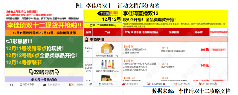 隨著這些文檔的快速傳播,機(jī)構(gòu)也開始關(guān)注起這一風(fēng)潮,一些研究機(jī)構(gòu)將自己收錄的信息通過在線文檔的形式傳播。而簡潔清楚的Excel更是幫助消費(fèi)者應(yīng)對越來越復(fù)雜的雙十一規(guī)則的利器。因此消費(fèi)品行業(yè)也是掀起了一股“EXCEL營銷”風(fēng)潮,成為一股新興的營銷勢力。例如李佳琦團(tuán)隊(duì)雙十一和雙十二活動期間均有自己制作的官方文檔活動推出,里面詳細(xì)收錄了活動時間、參與方式、到手價格等一系列信息,消費(fèi)者一目了然就能夠獲取商品所有的信息和優(yōu)惠的詳細(xì)內(nèi)容,只需照單購買。