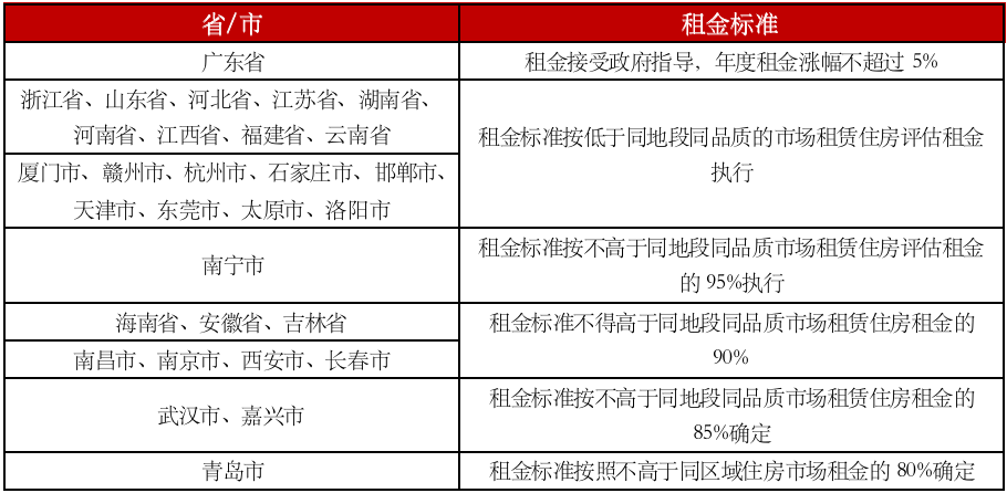 (2)明確保租房租金低于同地段同品質(zhì)市場(chǎng)租賃住房租賃租金。浙江省、山東省、河北省、江蘇省、湖南省、河南省、江西省、福建省、云南省,以及廈門市、贛州市、杭州市、石家莊市、邯鄲市、天津市、東莞市、太原市、洛陽市等省市沿用國(guó)辦22號(hào)文表述,即“租金標(biāo)準(zhǔn)按低于同地段同品質(zhì)的市場(chǎng)租賃住房評(píng)估租金執(zhí)行”。