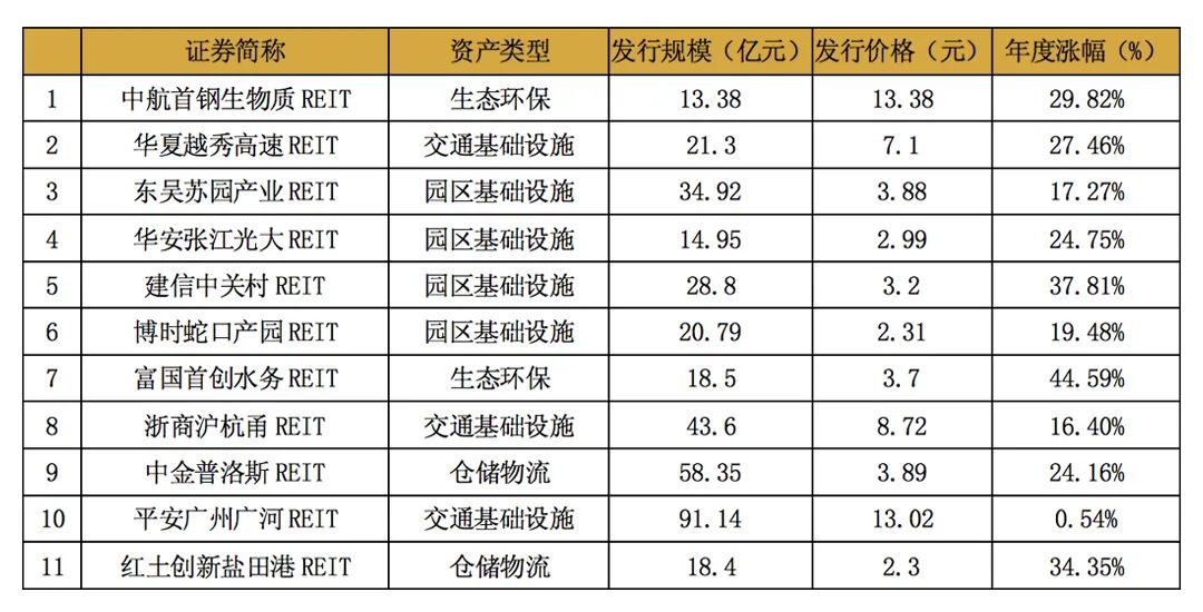 表1 國內11支上市REIT發行情況