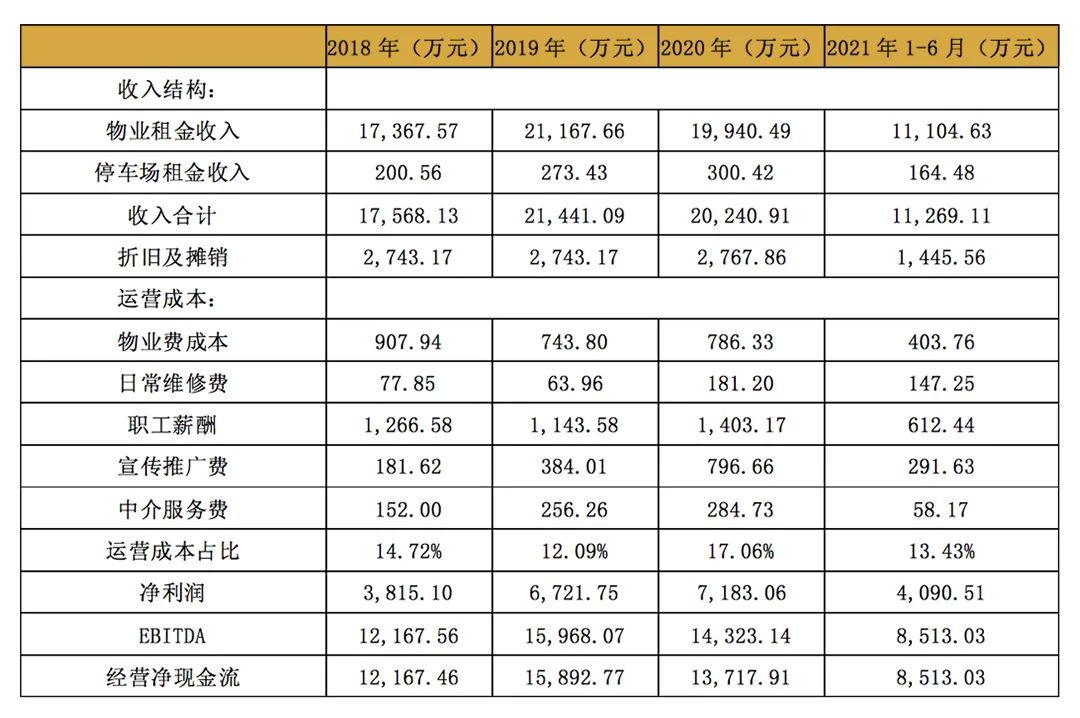收入方面,2018年、2019年、2020年和2021年1-6月,標的基礎設施項目分別取得租金收入17,568.13萬元、21,441.09萬元、20,240.91萬元和11,269.11萬元,其中物業租金收入占比分別為98.86%、98.72%、98.52%和98.54%,停車場租金收入占比分別為1.14%、1.28%、1.48%和1.46%。