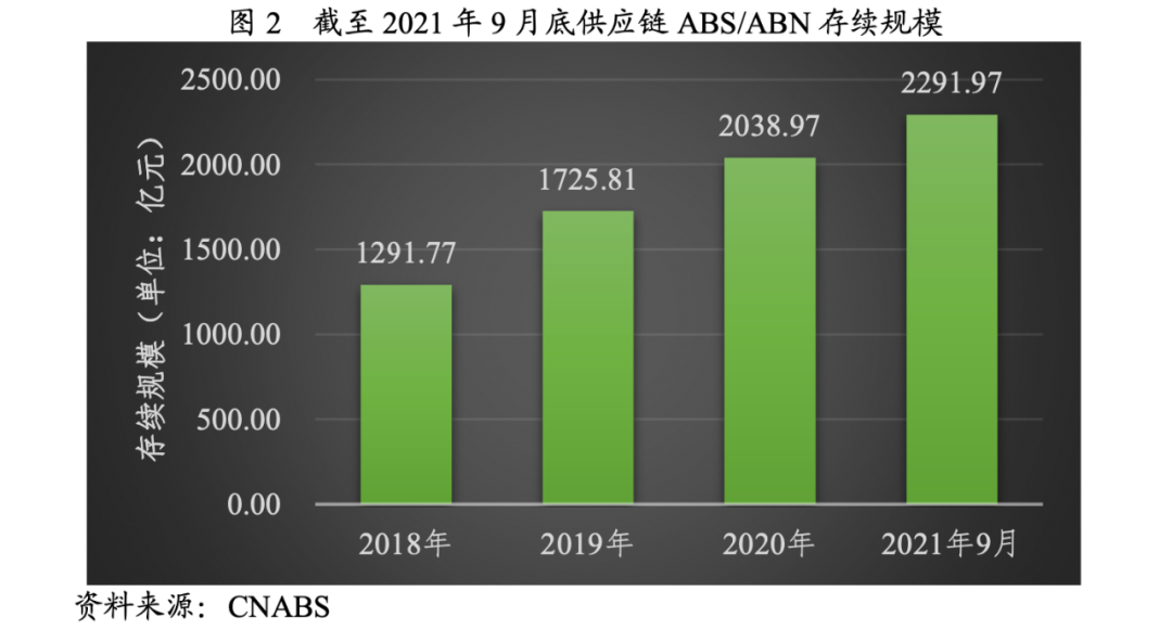 供應(yīng)鏈融資以房企應(yīng)付賬款為基礎(chǔ)資產(chǎn),采用“1+N”反向保理模式,以單一核心企業(yè)及其下屬公司為債務(wù)人的供應(yīng)鏈資產(chǎn)證券化產(chǎn)品在解決上游供應(yīng)商資金回籠。近三年,房企供應(yīng)鏈融資存續(xù)規(guī)模呈逐年遞增態(tài)勢(shì)。截至2021年9月底,房企供應(yīng)鏈存續(xù)規(guī)模2291.97億元,其中前三大房企(萬科企業(yè)股份有限公司、碧桂園地產(chǎn)集團(tuán)有限公司和保利發(fā)展控股集團(tuán)股份有限公司)存續(xù)金額[4]分別為685.75億元、162.19億元和160.48億元。