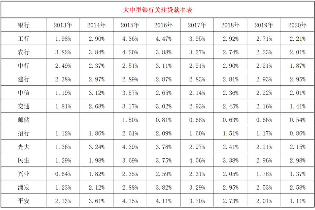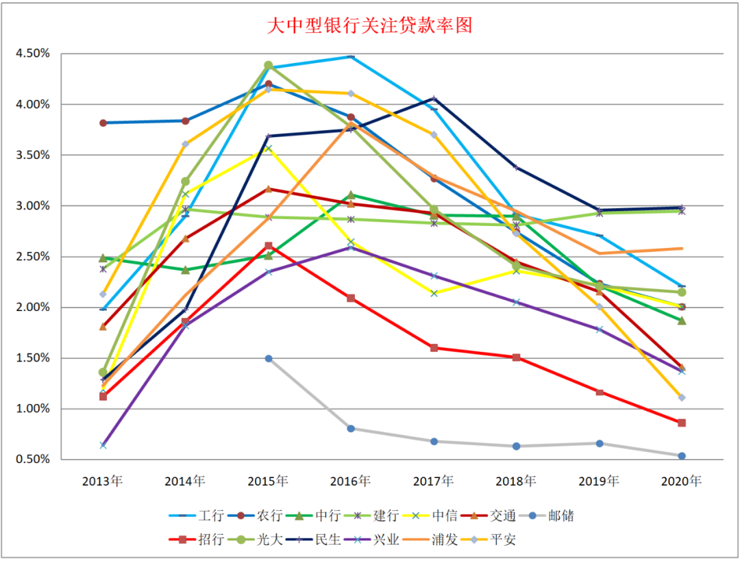 3、關注貸款率情況。五級分類中關注貸款是一個先行指標,絕大多數不良貸款來自關注貸款,有朋友提議從遷徙率數據等方面分析新生關注率這個指標。2015-2016年,平均關注貸款率都超過3.2%,而2020年只有1.8%,從這點可以看出目前的資產質量還是可以的,2021年應該會有不錯的表現。這里還需要提一下招商銀行,關注貸款率只有0.86%,作為一家摸爬滾打這么多年的全國性銀行,這個關注貸款率是非常優異的數據。