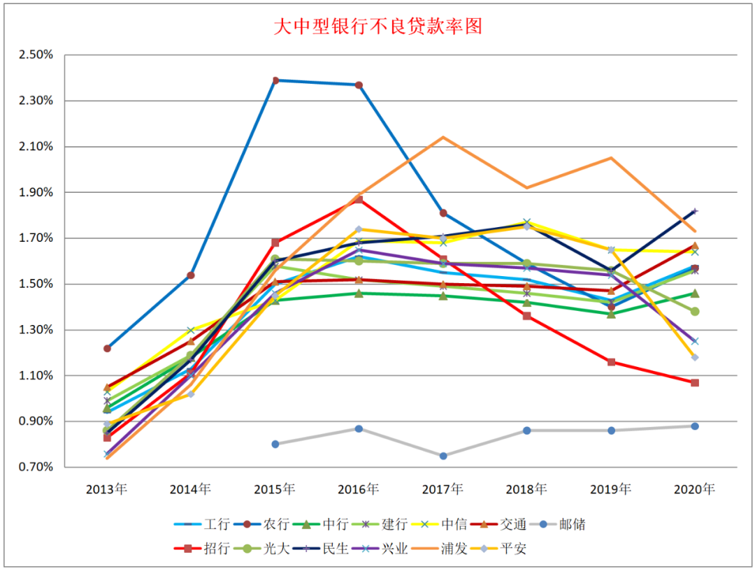2、不良貸款率情況。由于經濟周期波動的原因,2013年平均不良貸款為0.93%,2016年為1.65%,2020年是1.45%。農業銀行因為歷史原因,2016年不良率很高,這幾年迅速下降,資產質量這幾年明顯改善。招商銀行2015-2016年主動暴露不良,大量出清對公業務,當時不良率僅次于歷史原因高企的農業銀行,后面幾年不良率大幅下降,從這個角度也可以看到招商銀行這幾年業績優異的一個原因。浦發銀行這幾年的不良率一直比較高,民生銀行2020年大核銷下不良率還繼續提升還是需要多給予關注。郵儲很多數據是神一般的存在,總感覺他們家和別的銀行還不在一個頻道上,總覺得沒有經過洗禮,還需要沉淀再看看。