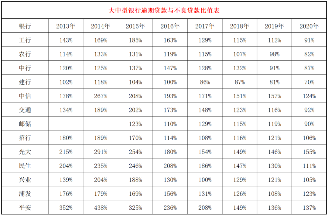 5、逾期貸款與不良貸款比值情況。這是一個硬核數據,也是本篇小文的一個主要探討點。不良貸款,關注貸款會受人為評判因素的影響,人為調劑不能說造假,但逾期貸款是硬核,逾期了和沒有逾期不存在灰色地帶,總不能說一個企業的貸款,可以歸為逾期,也可以歸為沒有逾期,否則就有造假的嫌疑。這個數據總體也是在逐年下降,2014年至今平均分別為:211%、188%、156%、138%、127%、118%和2020年的106%,和關注與不良比一樣說明銀行業這些年對不良的認定越來越嚴格,大趨勢就是這樣。具體情況看,六大國有銀行認定標準要更嚴格,他們是都低于100%,也就是說逾期貸款全部納入不良了,當然也有可能部分逾期沒有納入不良,但沒有逾期的不少納入不良,總體是逾期貸款小于不良貸款。這里面要特別強調的是建設銀行和農業銀行,逾期貸款與不良的比值只有七折和八折,從這個角度看對不良的認定是很苛刻的,之前農行官方表態率先將20天以上逾期全部納入不良。這個數據比較弱的是光大銀行和平安銀行。