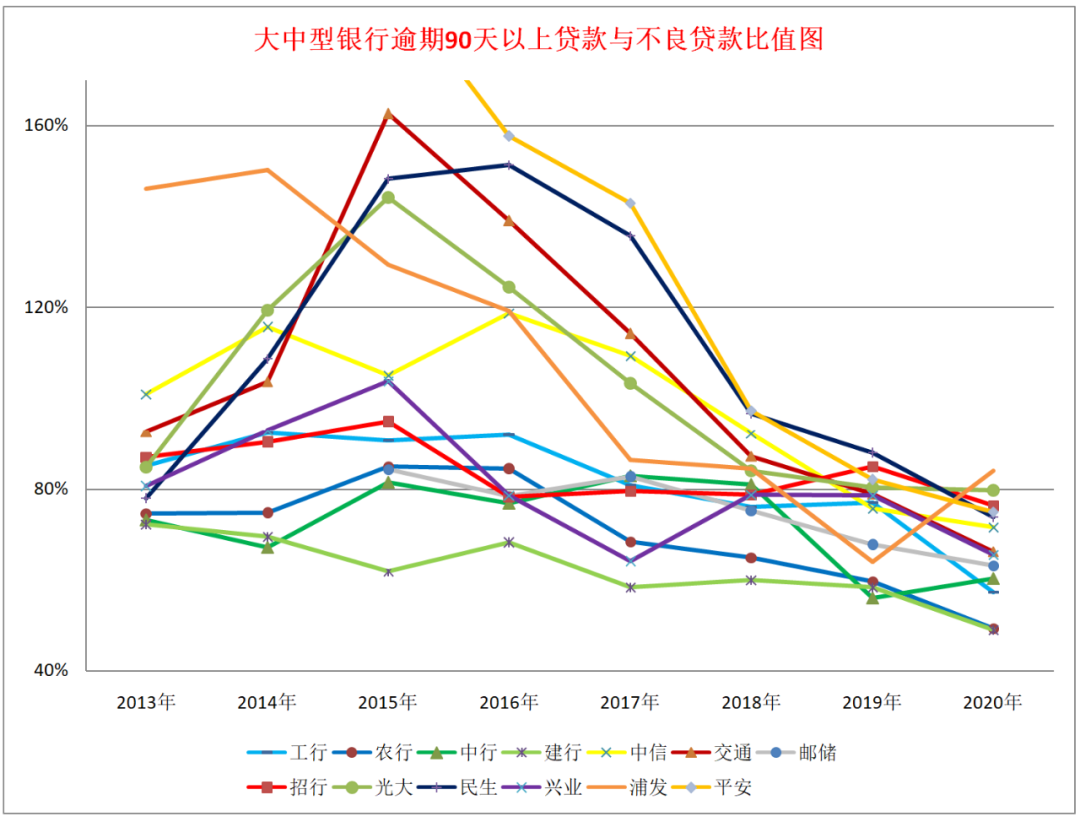 1、總體規律。十年前銀行的不良率是很低的,然后不良貸款率一直攀升,2015-2017年達到峰值,2018-2019年總體下降,疫情影響2020年有所抬頭,2021年大概率會繼續往下。關注貸款從數據看確實是不良貸款的先行指標,關注貸款是在2014-2015年達到峰值,總體看比不良要早一些。在逾期貸款、逾期90天以上貸款與不良貸款的比值上,總體上是不斷下降的,也就是對資產質量認定的標準是越來越嚴格。