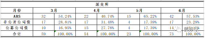 ABS方面,目前尚未見到監(jiān)管部門特別針對限制ABS類產(chǎn)品的新規(guī),其中一個重要原因之一大概是ABS存在基礎(chǔ)資產(chǎn),且從實際市場表現(xiàn)來看,違約率頗低。從六月份的數(shù)據(jù)來看,ABS基本已經(jīng)恢復到新規(guī)前的水平,深交所甚至已經(jīng)超過新規(guī)前的水平。