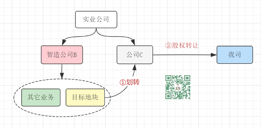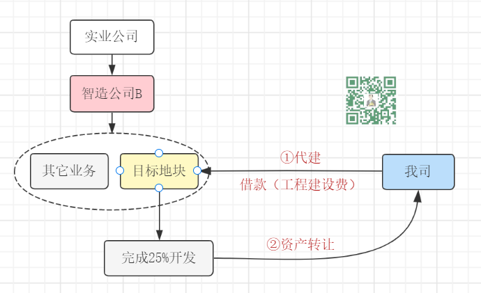 ▲實操中——在劃轉過程中圍繞著目標公司本身的主營來操作(大部分都為實業公司),由此達到免征土地增值稅的效果。未來再申請房產開發資質,并更經營范圍,前期則通過代建模式先行開發。
