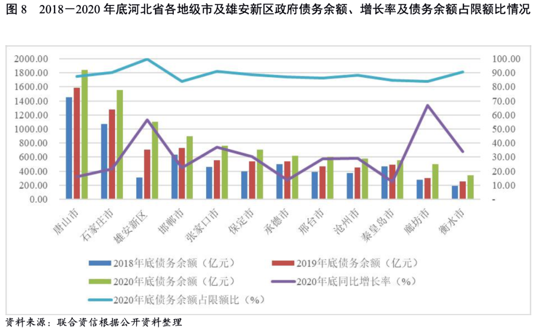 2020年,河北省發債城投企業債務負擔進一步加重,其中張家口市、邢臺市、保定市和承德市的發債城投企業債務負擔較重,唐山市的發債城投企業未來三年到期債券規模較大,秦皇島市、滄州市、唐山市的短期償債壓力相對較大。
