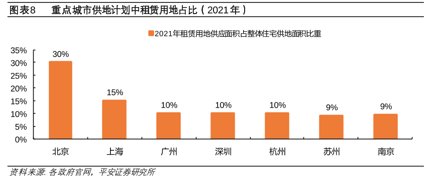 如上圖所示,2021年全國(guó)重點(diǎn)城市租賃住房用地的供應(yīng)面積,只有北京達(dá)30%,上海、廣州等其他城市位于9%~15%的水平,供應(yīng)規(guī)模在居住用地中的比例偏少,可見(jiàn)盡管監(jiān)管部門(mén)一再呼吁,但地方從源頭上做大租賃住房市場(chǎng)的動(dòng)力仍不足。