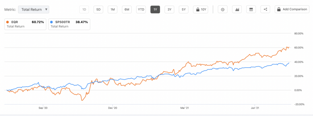 尤其今年5月,美國(guó)新房建設(shè)成本同比增長(zhǎng)11%,這是自1980年以來(lái)最高值(如上圖所示)。過(guò)去40年大部分時(shí)間美國(guó)建筑成本都在上升,加上受到通脹回升及通脹交易的雙重提振,美股市場(chǎng)REITs的平均回報(bào)率超過(guò)25%,其中公寓REITs更是超過(guò)35%,大幅跑贏行業(yè)及美股主要股指,同類(lèi)資產(chǎn)中表現(xiàn)僅次于私人倉(cāng)儲(chǔ)REITs。但從規(guī)模而言,20只公寓REITs總市值超過(guò)2100億美元,是美股市場(chǎng)REITs的絕對(duì)權(quán)重之一,有如此回報(bào)彈性也著實(shí)驚人。