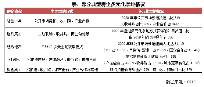 例如旭輝,2020年通過一二線聯(lián)動、收并購、商業(yè)勾地等多元化拿地方式獲得的項目貨值占比由2019年的33%提升至51%。此外,越秀也不斷完善、豐富“6+1”的多元土地獲取模式,包括TOD、城市更新、“住宅+配建”、國企合作、收并購、產(chǎn)業(yè)勾地和公開市場競拍,在2020年新增投資中通過非公開市場獲取的地塊占比達到54.1%,TOD、“住宅+配建”、國企合作增儲模式分別占新增土儲的18.5%、25.2%和10.4%。