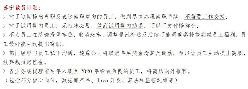 據(jù)說(shuō),蘇寧自從大年初八的開(kāi)工大會(huì),傳達(dá)了“該關(guān)的關(guān),該砍的砍”這個(gè)思想,就制定了裁員計(jì)劃,而且要在2021年4月底前完成第二季度裁員指標(biāo)。