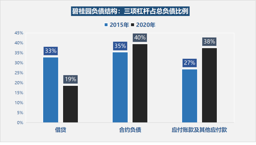 從2015年以來碧桂園的杠桿比例可以看出:借貸在總負(fù)債比例中下降明顯,而應(yīng)付賬款和其他應(yīng)付款明顯上升。