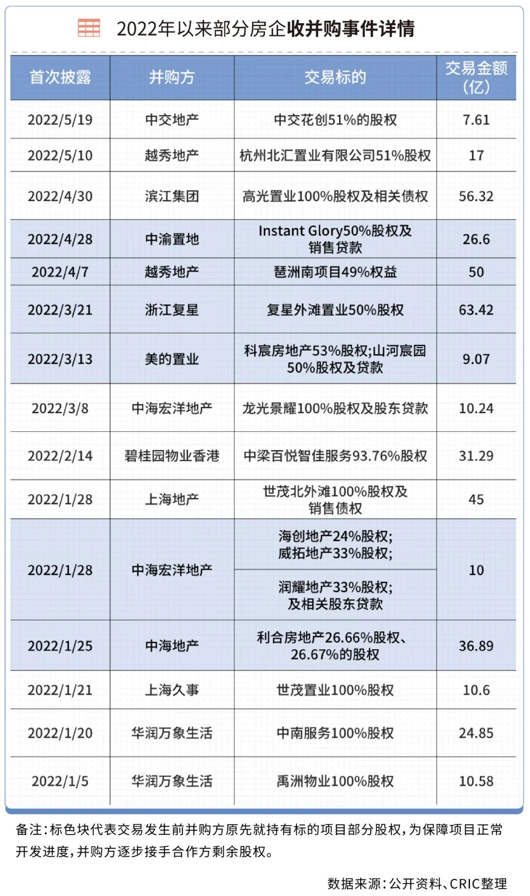 從具體并購事件來看,根據CRIC對公開資料監測統計,截至5月25日,2022年百億元以上的并購案例罕見,只有極少數大規模收購資產包案例,多數并購案例均集中于單項目或物管層面。
