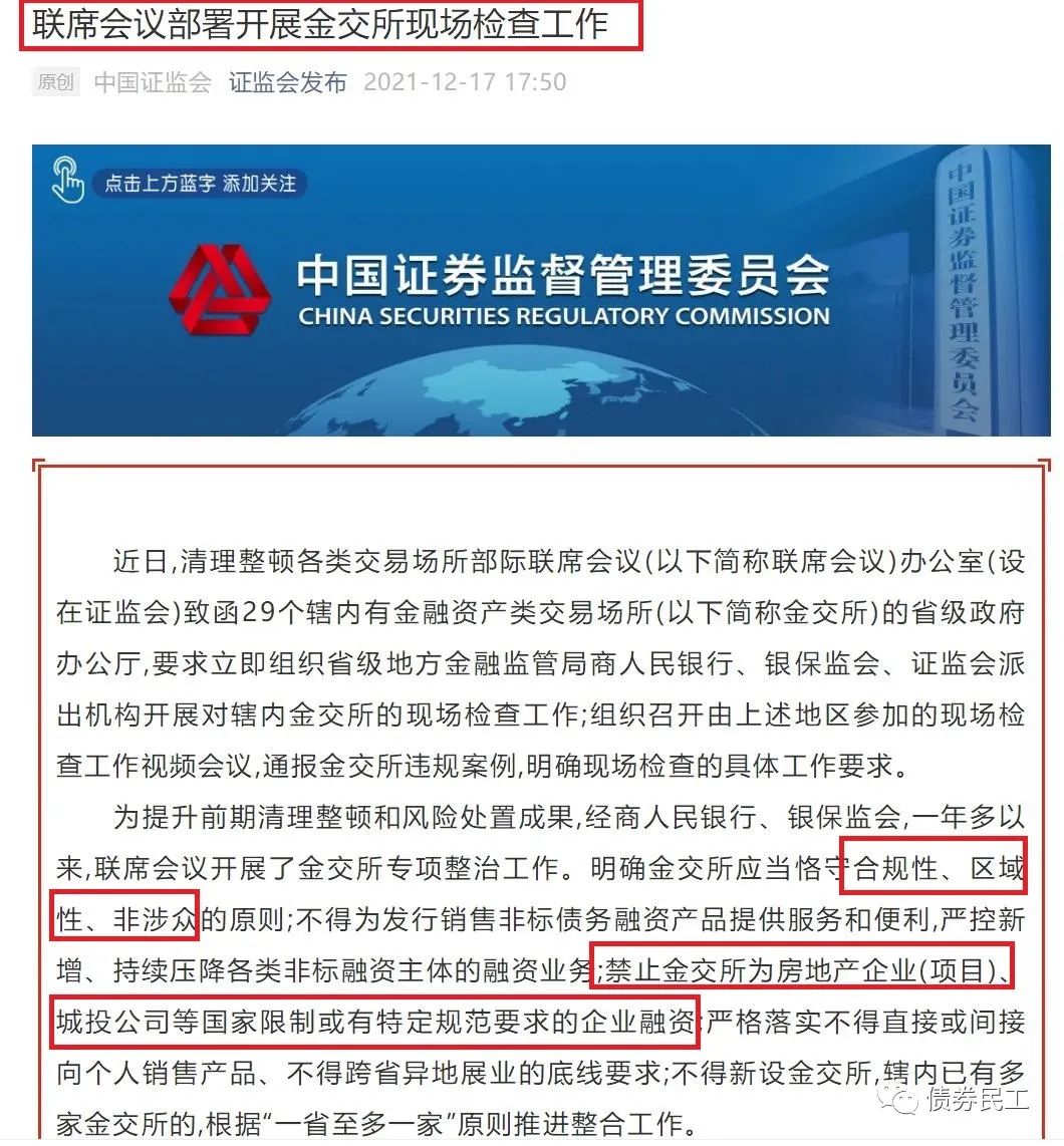 根據由中國證監會牽頭的清理整頓各類交易場所部際聯席會議于2021年12月17日發布的《聯席會議部署開展金交所現場檢查工作》,提出了對于金融資產類交易所新的監管要求。本次聯席會議對于金交所的監管提出了很多的要求,但是債券民工最關注的是其中對于城投公司的監管規則:“禁止金交所為房地產企業(項目)、城投公司等國家限制或有特定規范要求的企業融資”,這應該是金交所的監管規則中對于城投公司融資最直接、最重要的一條監管要求。