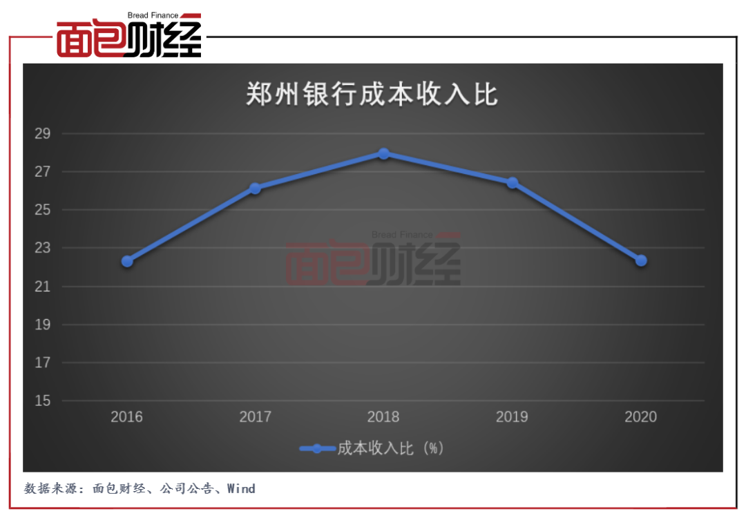 截至2020年末,鄭州銀行的成本收入比為22.40%,較上年末下降4.06個百分點,成本收入比連續兩年出現下降。