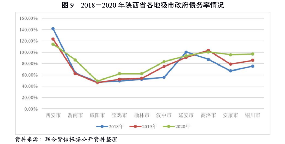 從發債城投企業全部債務與“發債城投企業全部債務+地方政府債務”的比值看,截至2020年末,西安市比值最高,達71.76%,延安市和咸陽市的比值超過50%,漢中市比值最低,為14.52%。