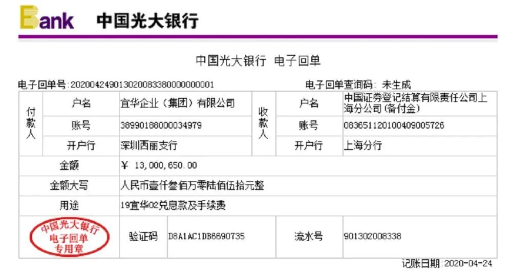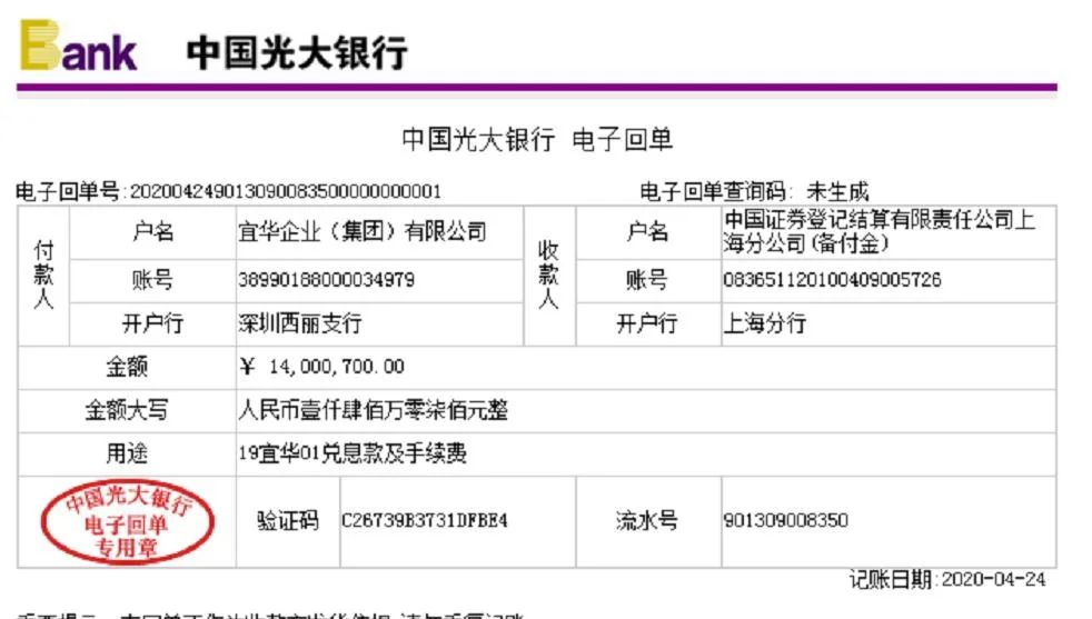 今日市場上流出宜華企業(集團)19宜華01、02兌息款的電子回單。