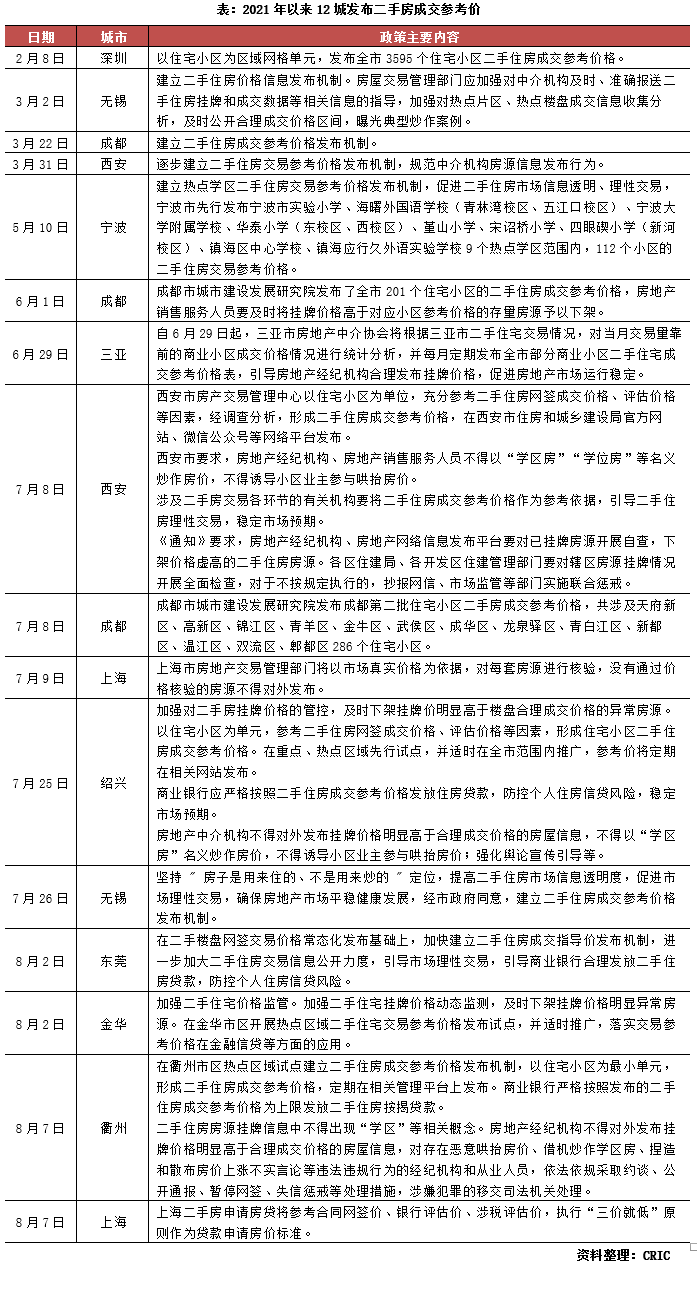 2021年以來(lái),熱點(diǎn)城市紛紛加碼調(diào)控,并下沉到縣級(jí)市,地方調(diào)控趨于高頻化、精準(zhǔn)化,根據(jù)市場(chǎng)過(guò)熱的實(shí)際情況,針對(duì)性采取調(diào)控政策措施,全面落實(shí)穩(wěn)地價(jià)、穩(wěn)房?jī)r(jià)、穩(wěn)預(yù)期。其中,二手房成交參考價(jià)成為本輪調(diào)控的新舉措。