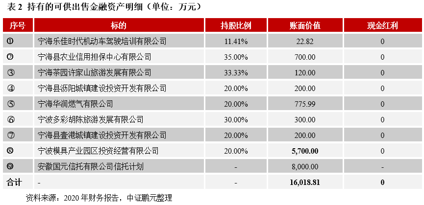再以寧波杭州灣新區開發建設有限公司為例。2020 年末,公司可供出售金融資產余額由上年末的1.83 億元減少至0,主要系因公司根據杭州灣新區管委會相關文件與區域內其他國企之間進行了資產整合劃轉,其中公司轉出的資產中包括了其持有的按成本計量的可供出售權益工具(明細如下),轉讓價款合計21,892.24萬元。此外,2020年公司收到寧波眾茂杭州灣新型墻材有限公司和寧波眾茂杭州灣熱電有限公司的現金分紅款,共計375萬元,計入投資收益,占當年營業利潤的比重僅為3.20%,對公司盈利的貢獻度較低。
