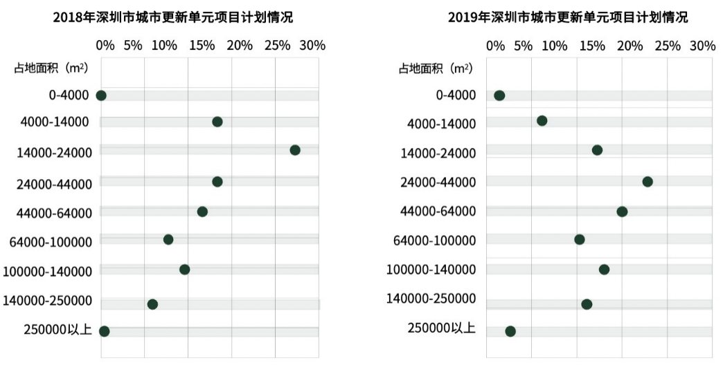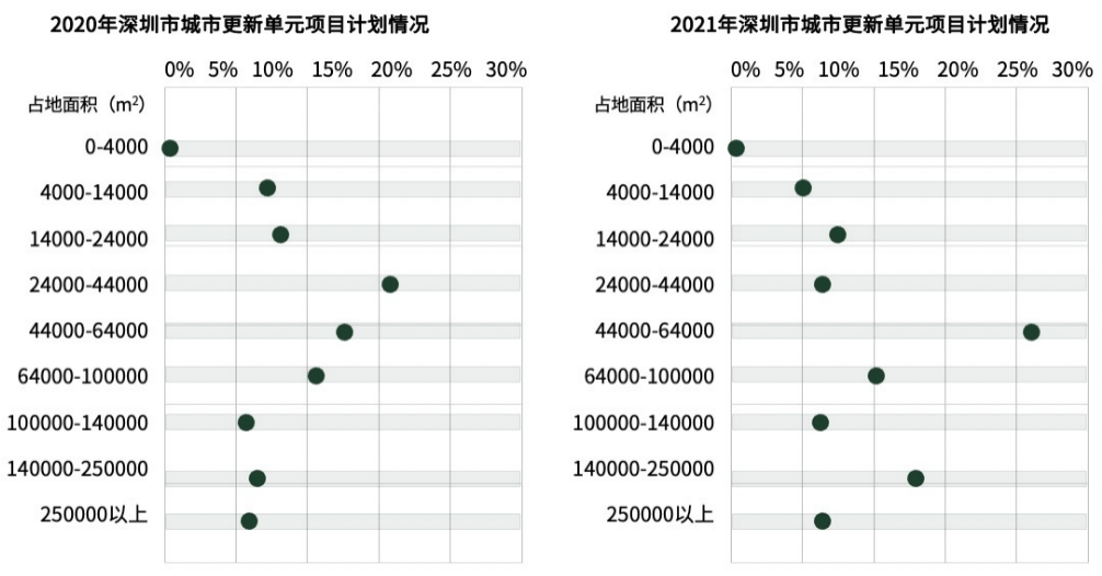 以市場成熟度以及立法完成度較高的深圳為例, 2018—2021年間,拆除重建項目無論是單項目體量或是計劃數量都存在明顯的增長趨勢。其中,18年至20年3年內項目計劃量以54%的年均復核增速增長至105幅。此外,21年上半年計劃量達到58幅,高于去年同期水平。在單項目體量上,18年深圳城市更新出讓項目的占地面積集中于0.4-1.4萬方,經過3年的城市發展,至21年,供應的項目規模提高,集中在2.4-4.4萬方,其中超25萬方大體量項目占比以年均9%遞增。
