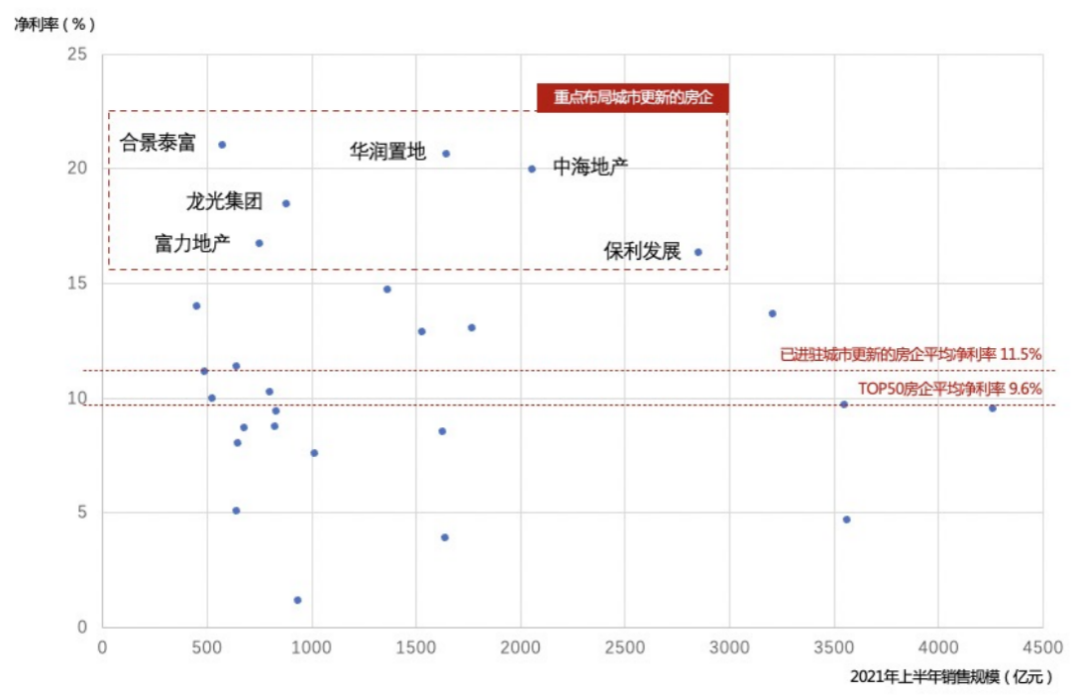 其中重點布局城市更新業務的5家房企,包括龍光、富力、華潤、中海、合景泰富,2021年上半年凈利率皆在16%以上,遠高于行業平均凈利率9.6%。城市更新對于房企而言,已上升到重點戰略的層面。